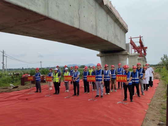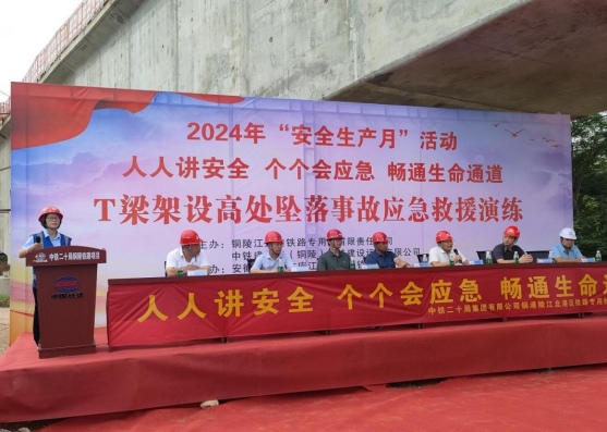 6月25日下午,江北港鐵路專用線有限責(zé)任公司聯(lián)合中鐵建長江(銅陵)港鐵建設(shè)運(yùn)營有限公司,在江北港鐵路專用線項(xiàng)目黃泥河特大橋68#墩附近舉辦T梁架設(shè)高處墜落事故應(yīng)急演練。本次演練由江北港鐵路專用線公司董事長、總經(jīng)理張葉來擔(dān)任總指揮,中鐵二十局項(xiàng)目經(jīng)理部安全總監(jiān)鐘健任現(xiàn)場(chǎng)指揮,廬江縣應(yīng)急管理局總工程師顧德祥、廬江縣發(fā)改委總工程師朱雷、泥河鎮(zhèn)人民政府黨委副書記高磊受邀蒞臨現(xiàn)場(chǎng)指導(dǎo)點(diǎn)評(píng)。江北港鐵路專用線公司安全質(zhì)量部、工程管理部,上海先行項(xiàng)目監(jiān)理部,中鐵十六局、中鐵二十局項(xiàng)目經(jīng)理部相關(guān)人員參加活動(dòng)。