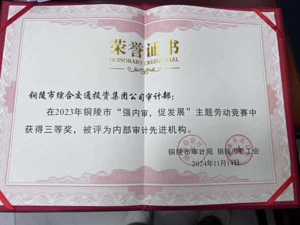 11月20日,市審計局舉辦全市內(nèi)部審計學(xué)習(xí)交流培訓(xùn)會,表彰2023年全市“強內(nèi)審,促發(fā)展”主題勞動競賽先進(jìn)單位,市交投集團(tuán)審計部榮獲三等獎,被評為“內(nèi)部審計先進(jìn)機構(gòu)”。