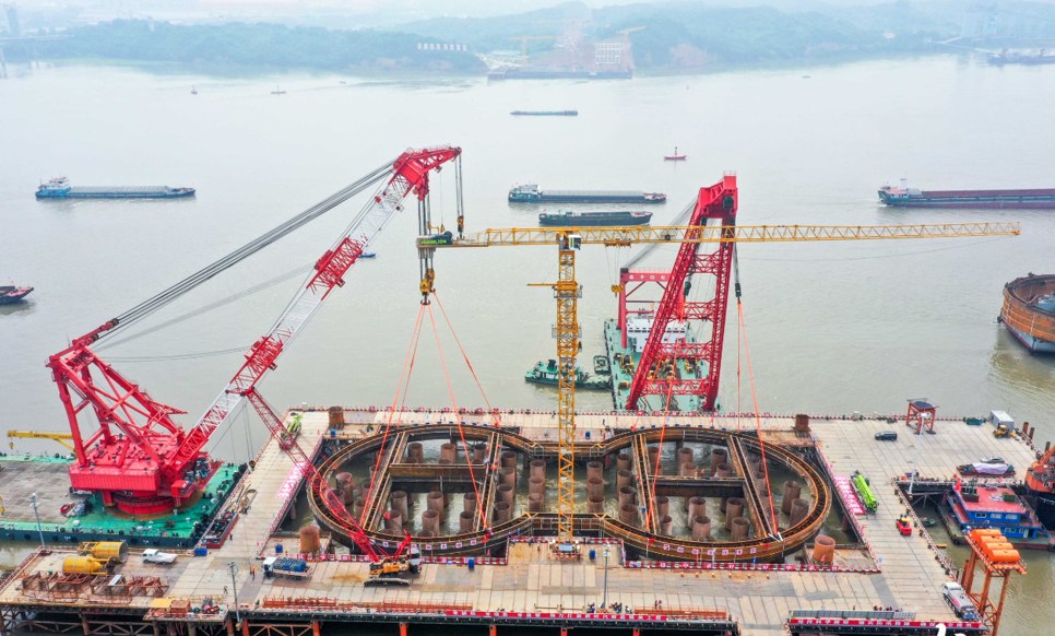 中鐵大橋局G3銅陵長江公鐵大橋3號(hào)主墩墩長沈堅(jiān)羽介紹,3號(hào)主墩鋼圍堰具有面積大、體量大、超長超寬超高運(yùn)輸難度大、雙浮吊吊裝同步性要求高、任務(wù)重、周期長等特點(diǎn)。我們按照G3橋“科學(xué)組織、創(chuàng)新求穩(wěn)、穩(wěn)中求好、好中求快”的建設(shè)理念,通過確保材料供應(yīng)、組織技術(shù)攻關(guān)、投入特殊設(shè)備、加大人員組織、強(qiáng)化過程控制等措施,組織專家編寫了專項(xiàng)施工方案,采用了大型運(yùn)輸船和吊船作業(yè),請(qǐng)海事部門指導(dǎo)安全通航保障,成立了10個(gè)專業(yè)化作業(yè)班組,多次進(jìn)行吊裝推演,確保這個(gè)‘龐然大物’順利制造、安裝。