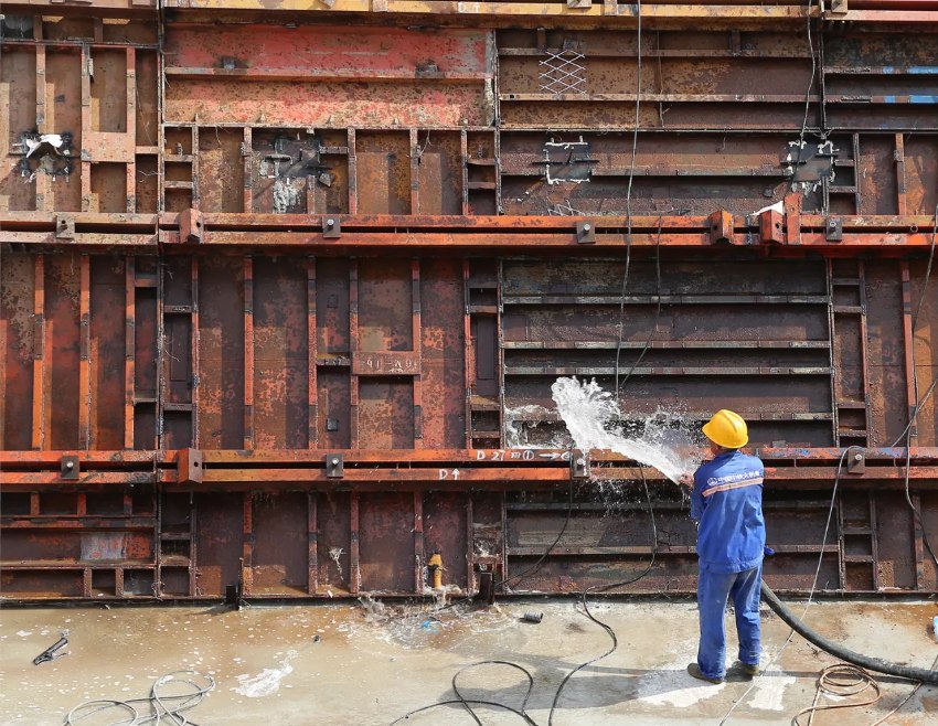 入夏后,持續(xù)的高溫天氣為現(xiàn)場施工帶來了諸多不利影響,為了控制混凝土的出廠溫度,項目部在混凝土攪拌過程中加入冰塊,同時對混凝土罐車進(jìn)行灑水冷卻,確?;炷吝\送到現(xiàn)場泵入模板時溫度低于30度,確?;炷临|(zhì)量。此外,經(jīng)過太陽長時間的照射,現(xiàn)場鋼模板內(nèi)部溫度往往會比氣溫高上許多,為降低混凝土芯部溫度,項目部在澆筑過程中,持續(xù)對外模板灑水降溫,同時在塔座及塔柱內(nèi)部設(shè)置了循環(huán)冷卻水管,一直循環(huán)至芯部溫度冷卻至安全水平,有效控制了混凝土內(nèi)外溫差,避免出現(xiàn)混凝土表面裂紋。