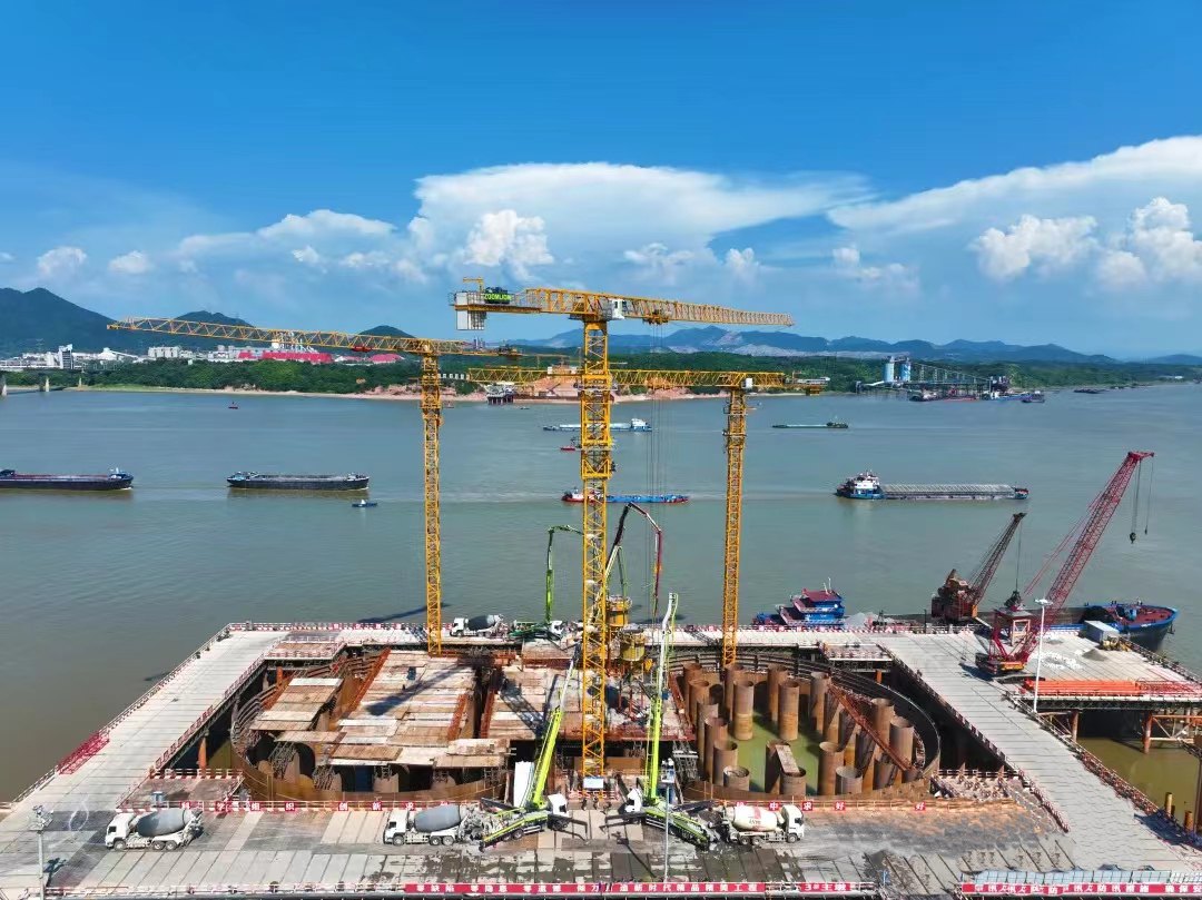 3號(hào)墩技術(shù)負(fù)責(zé)人潘萌介紹,根據(jù)3號(hào)墩圍堰結(jié)構(gòu)特點(diǎn)、封底混凝土的數(shù)量及混凝土的生產(chǎn)運(yùn)輸能力,整個(gè)鋼圍堰分成7個(gè)隔艙進(jìn)行封底,單艙封底混凝土最大達(dá)4033.0立方米。根據(jù)施工方案要求,按照從低處到高處的原則對(duì)圍堰各個(gè)隔艙進(jìn)行封底。“此次施工采用中央集料斗拔球,多導(dǎo)管布置、從低角落向?qū)?cè)逐步推進(jìn)的水下混凝土封底工藝?!迸嗣冉榻B,現(xiàn)場(chǎng)施工時(shí),將中央集料斗臨時(shí)固定在相應(yīng)位置,采用多臺(tái)汽車泵向中央集料斗集中供料,待集料斗中混凝土滿足首灌要求后,進(jìn)行首灌“拔球”,其余導(dǎo)管采用“插管法”施工,不斷循環(huán)往復(fù),直至封底完成。