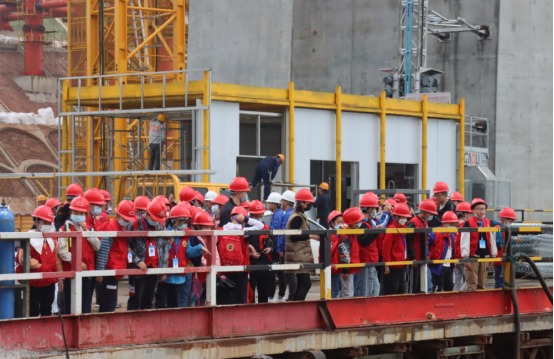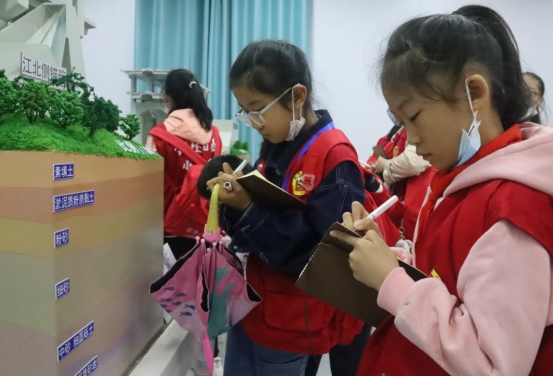上午9時許,一輛承載著小記者們歡聲笑語的大巴車緩緩駛?cè)隚3銅陵長江公鐵大橋建設(shè)基地,小記者們有序下車后,按照規(guī)范佩戴好安全帽,便在工作人員的帶領(lǐng)下參觀G3公鐵橋南岸建設(shè)現(xiàn)場,面對著聳立江面的G3銅陵長江公鐵大橋4號墩,小記者們驚嘆于現(xiàn)代科技的鬼斧神工,并化作自己的語言記錄在筆記本上。