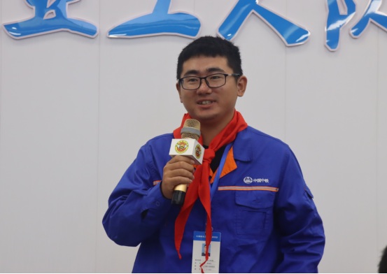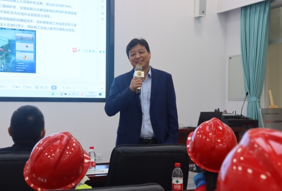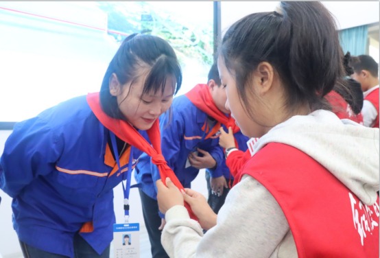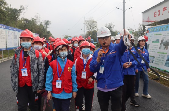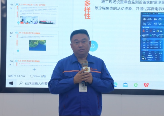 參觀結(jié)束后,小記者們來到展演廳,一起觀看G3橋建設(shè)宣傳片、聆聽G3橋安全總監(jiān)周啟輝講解生物多樣性相關(guān)知識以及G3橋建設(shè)期間對生物多樣性保護的措施。一張張?zhí)匦Ю瓭M的動態(tài)效果圖,一幀幀凝聚著建筑工人汗水的畫面,給小記者們留下了深刻的印象。小記者代表們?yōu)榻ㄔO(shè)者們戴上鮮紅的紅領(lǐng)巾,表達(dá)對他們的崇敬之情。