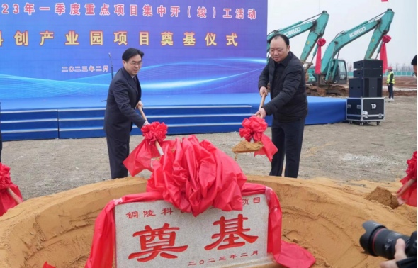 最后,伴隨著巨擘合鳴,眾位領(lǐng)導(dǎo)共同執(zhí)鍬培土,見證這一榮耀時(shí)刻,同時(shí)也標(biāo)志銅陵科創(chuàng)產(chǎn)業(yè)園正式步入建設(shè)軌道。儀式結(jié)束后,集團(tuán)公司董秘、銅陵科創(chuàng)產(chǎn)業(yè)園有限公司董事長、總經(jīng)理凌昌盛向現(xiàn)場領(lǐng)導(dǎo)、嘉賓介紹目前工程進(jìn)展、2023年投資計(jì)劃和入園科創(chuàng)企業(yè)相關(guān)情況。