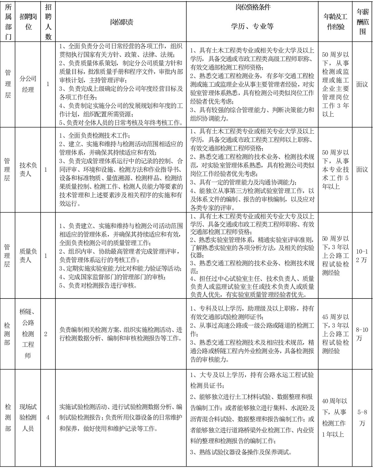 2.應(yīng)聘者如為銅陵或周邊地區(qū)人士,相同條件下可優(yōu)先錄用,現(xiàn)場(chǎng)試驗(yàn)人員能駐工地試驗(yàn)室者優(yōu)先考慮。