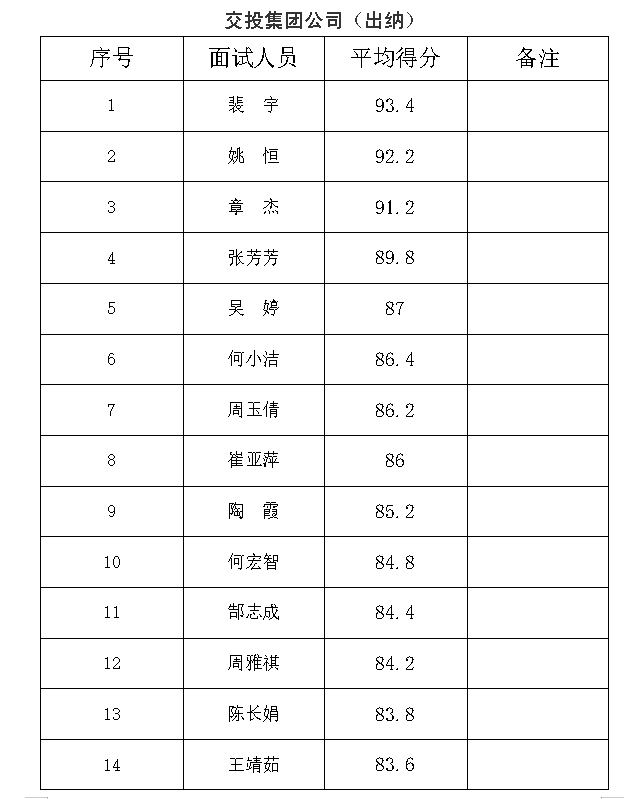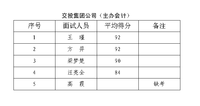 各位考生: 根據《銅陵市綜合交通投資集團有限公司公開招聘人員公告》,我公司已于2021年8月6日開展銅陵市綜合交通投資集團有限公司出納、主辦會計面試工作,現(xiàn)將報名參與人員面試成績公示如下:
