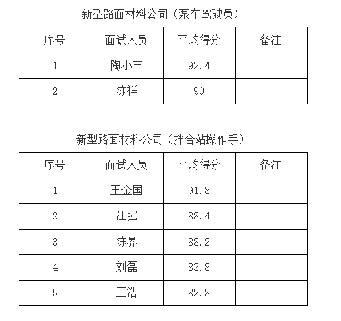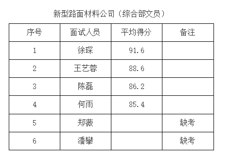根據(jù)《銅陵市綜交新型路面材料有限責(zé)任公司公開招聘人員公告》,我公司已于2021年9月5日開展銅陵市綜交新型路面材料有限責(zé)任公司相關(guān)崗位面試工作,現(xiàn)將面試成績(jī)公示如下:
