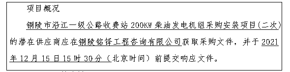 項(xiàng)目名稱:銅陵市沿江一級(jí)公路收費(fèi)站200KW柴油發(fā)電機(jī)組采購安裝項(xiàng)目(二次)