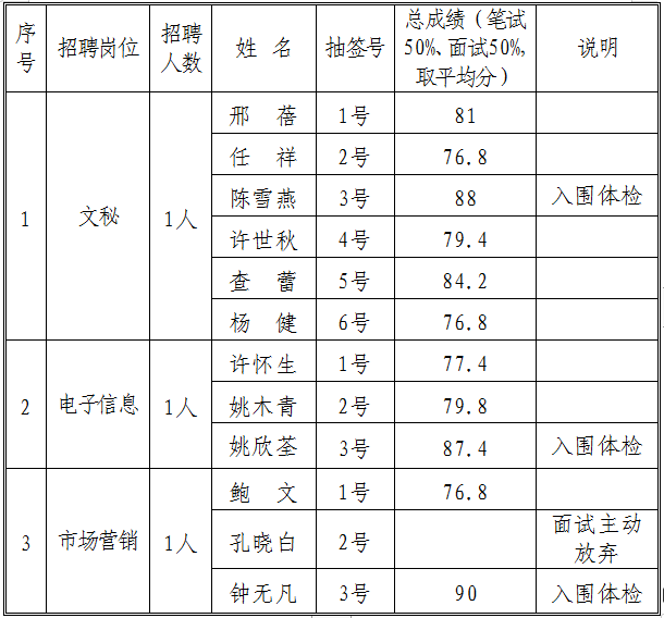 現(xiàn)將交投集團(tuán)公司文秘、電子信息、市場(chǎng)營(yíng)銷(xiāo)崗位招聘體檢入圍人員名單公示如下:
