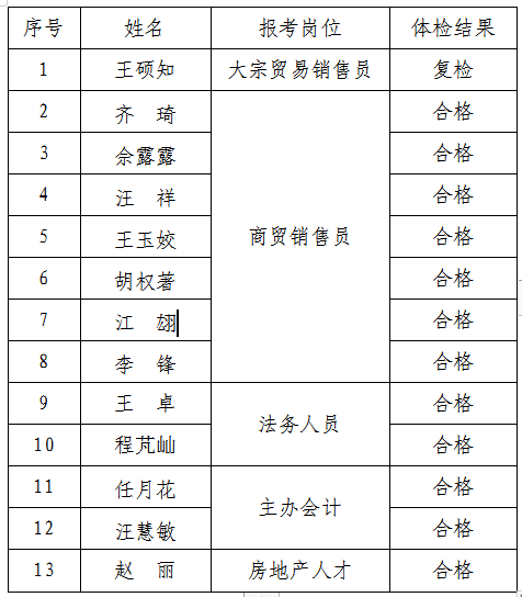 根據(jù)《銅陵市綜合交通投資集團(tuán)有限公司招聘人員公告》,集團(tuán)公司綜合部于2020年4月8日組織相關(guān)崗位入圍報(bào)考者參加體檢,現(xiàn)將相關(guān)體檢結(jié)果向社會進(jìn)行公示: