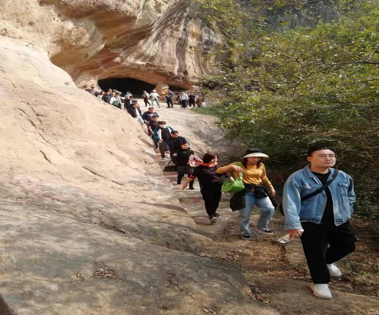 活動(dòng)中,在講解員的講解下,大家詳細(xì)了解了浮山的整體概況和人文歷史。在主景區(qū),瀏覽了藏在山里的洞——馬蹄洞、摩崖石刻群、雷公洞、亞洲第一橋——仙人橋等景點(diǎn)。在登山過程中,大家一邊聽著講解員的介紹;一邊欣賞著浮山美景,仿佛步入了人間仙境,十分悠然自得。