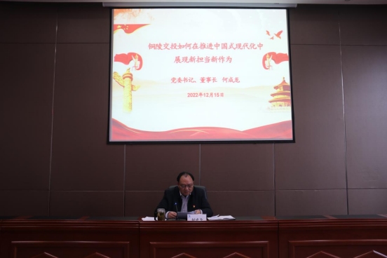 12月15日下午,集團(tuán)公司黨委書記、董事長(zhǎng)何成龍同志以《銅陵交投如何在推進(jìn)中國(guó)式現(xiàn)代化中展現(xiàn)新?lián)?dāng)新作為》為主題,為集團(tuán)公司黨委班子成員、中層以上管理人員、職工黨員、入黨積極分子、職工群眾以及青年團(tuán)員上了一堂精彩的專題黨課。