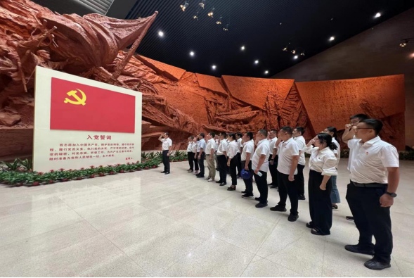 在渡江戰(zhàn)役紀(jì)念館內(nèi),G3公鐵橋項目部第一黨支部書記趙懿帶領(lǐng)全體黨員同志,面向黨旗,高舉右拳,莊嚴(yán)宣誓,在字字鏗鏘中重溫入黨誓詞,抒發(fā)對黨忠誠的堅定決心。黨員同志在講解員的帶領(lǐng)下,依次參觀戰(zhàn)前形勢、戰(zhàn)役準(zhǔn)備、突破江防、戰(zhàn)役勝利、人民支前和英烈業(yè)績六大展廳,通過大量實物、圖片和文物資料,與歷史“對話”,與英雄“交流”,感受西梁山戰(zhàn)役的英勇、搶灘登陸的緊迫、烈士名錄廳的沉重,深刻感悟黨團結(jié)帶領(lǐng)人民歷經(jīng)千難萬險攻克難關(guān),創(chuàng)造奇跡的革命歷程。