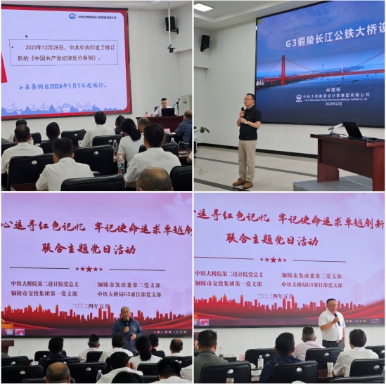 現(xiàn)場(chǎng)參觀過(guò)后,在G3大橋項(xiàng)目部會(huì)議室,中鐵大橋院黨建工作部部長(zhǎng)劉建軍、中鐵大橋院總工程師、G3銅陵長(zhǎng)江公鐵大橋總設(shè)計(jì)師肖海珠分別以《中國(guó)共產(chǎn)黨紀(jì)律處分條例》解讀、斜拉懸索協(xié)作體系橋設(shè)計(jì)為題作了輔導(dǎo)講座,并與聯(lián)合單位進(jìn)行了交流探討。集團(tuán)公司黨委副書記方勁松、中鐵大橋局G3項(xiàng)目部經(jīng)理劉幸福參與交流。