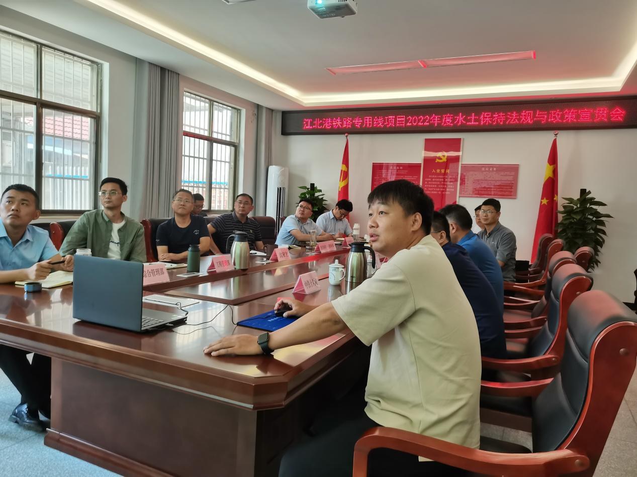 為提高全體參建單位水保法律法規(guī)意識,扎實有序推進(jìn)項目建設(shè)期水土保持管理工作,6月9日上午,江北港鐵路專用線公司組織召開項目2022年度水土保持法規(guī)與政策宣貫會。公司副總經(jīng)理高家立主持會議。集團(tuán)公司總工程師,江北港鐵路公司董事長、總經(jīng)理張葉來,公司部門相關(guān)人員、十六局項目經(jīng)理部、上海先行項目監(jiān)理部相關(guān)人員出席會議,二十局項目經(jīng)理部以視頻方式參會。