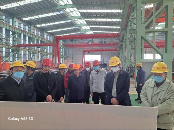 湯世才一行首先前往驗(yàn)收現(xiàn)場,詳細(xì)了解了鋼錨梁首件制造、拼裝過程、結(jié)構(gòu)特點(diǎn)及重難點(diǎn)分析等內(nèi)容,并前往施工車間查看了主梁的生產(chǎn)進(jìn)度。