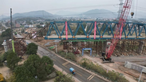 11月27日,由銅陵江北港鐵路專用線公司負(fù)責(zé)建設(shè)的銅陵江北港鐵路專用線項(xiàng)目橫埠特大橋80米有砟軌道簡支鋼桁梁成功頂推到位,這也是江北港鐵路專用線項(xiàng)目全線最長的鋼桁梁。